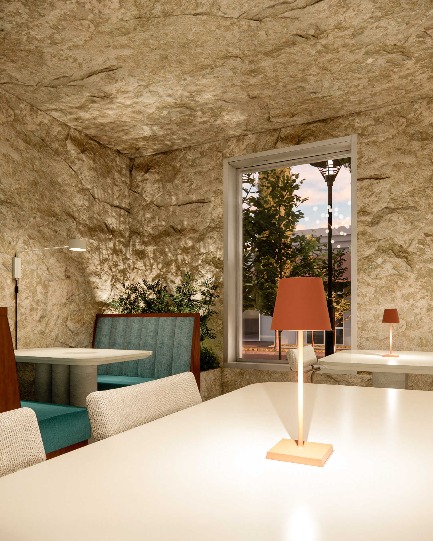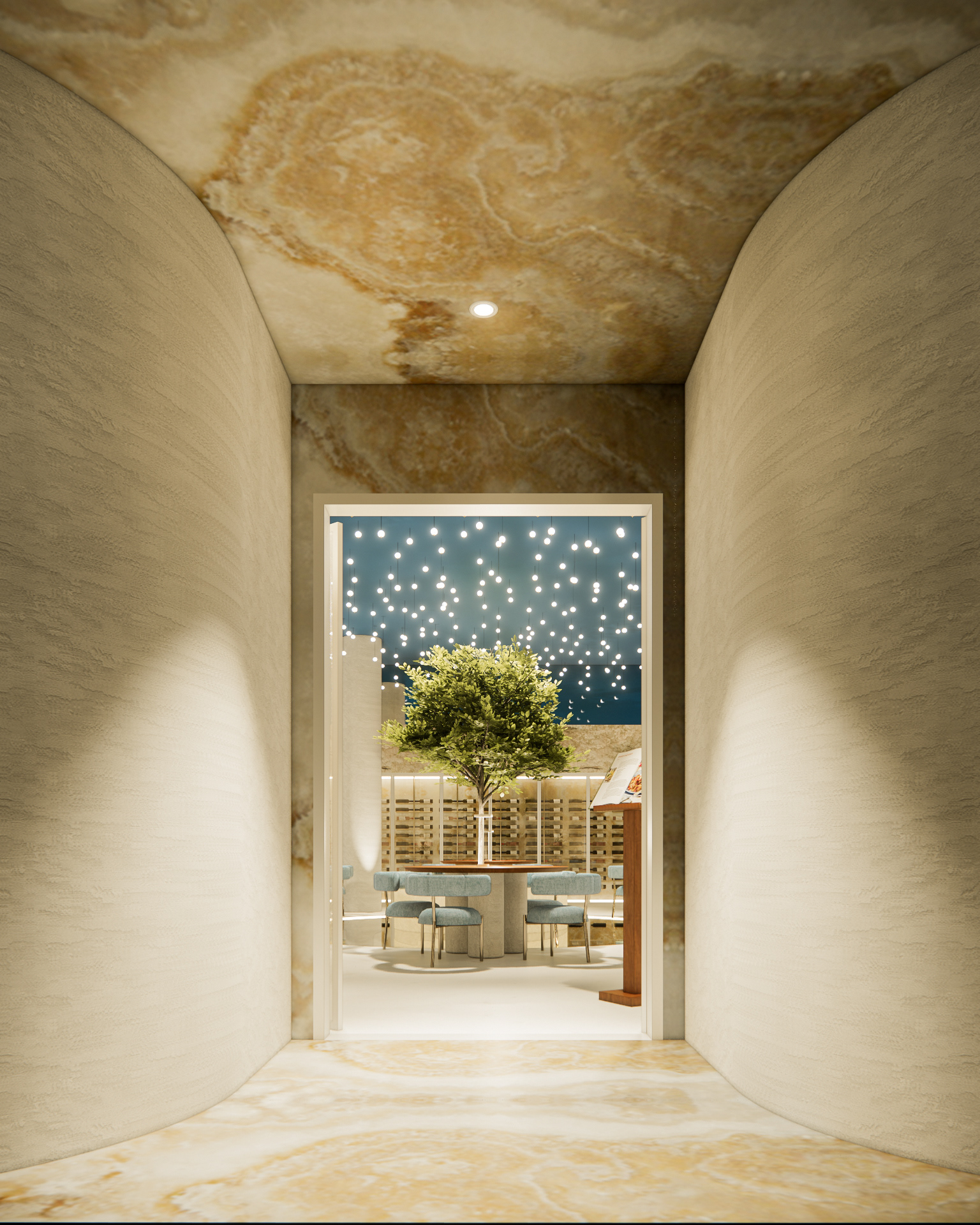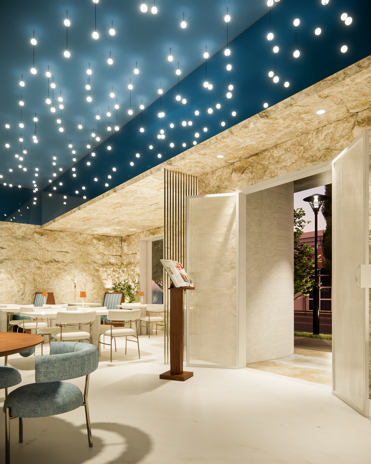 O Lunaro é um refúgio onde o céu e a terra se encontram. Entre paredes de pedra bruta e o brilho suave de luzes suspensas como constelações, o restaurante convida os clientes a vivenciarem um jantar intimista, marcado por sabores robustos e sofisticados. Carnes preparadas com precisão, massas artesanais que carregam a tradição e vinhos selecionados que elevam cada experiência compõem um cardápio que celebra a intensidade da terra e a poesia do céu. O espaço minimalista em tons de azul, branco e bege, unido à presença das rochas naturais, reforça a sensação de atemporalidade — como se cada jantar fosse um momento suspenso, eterno.